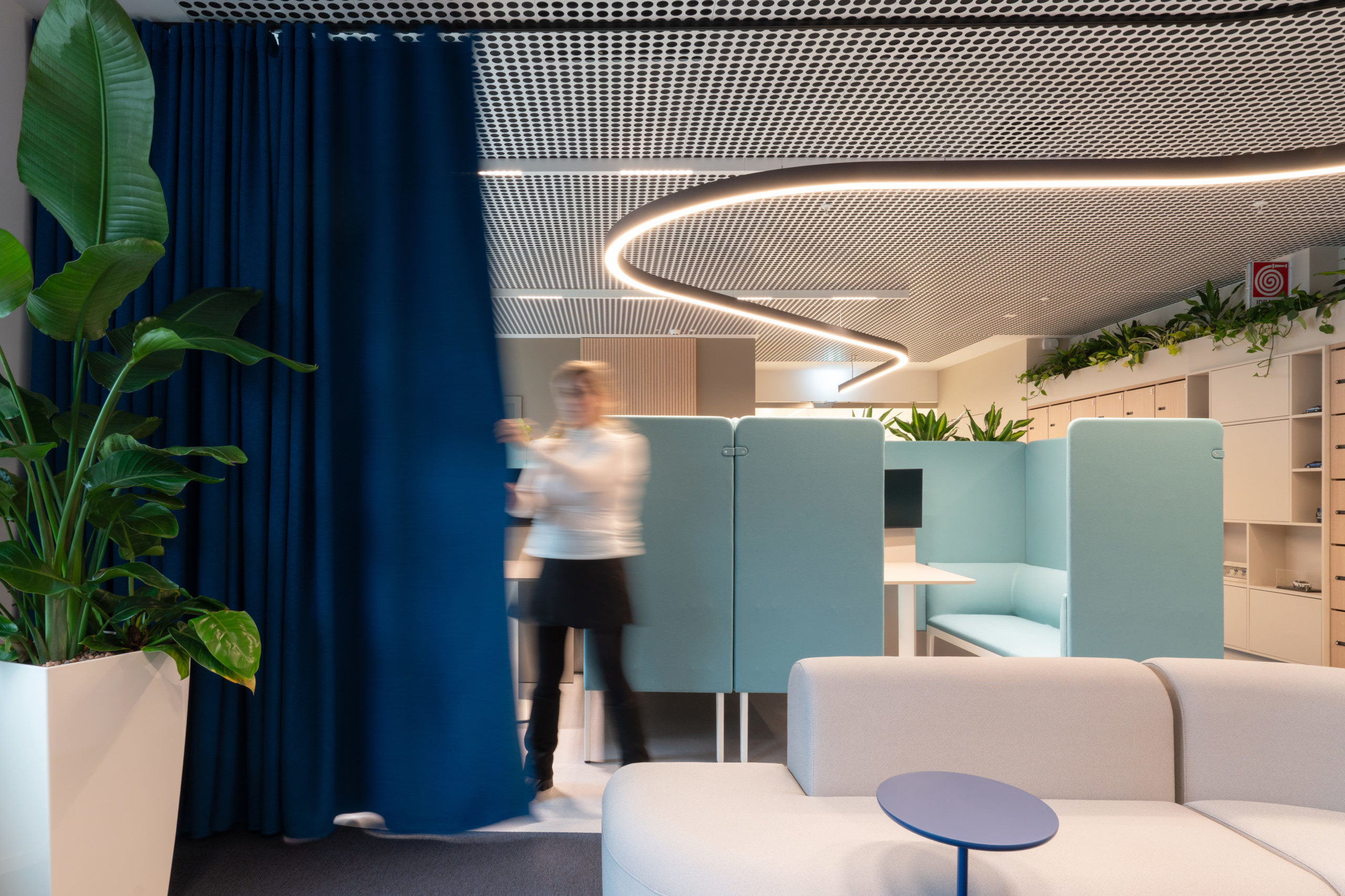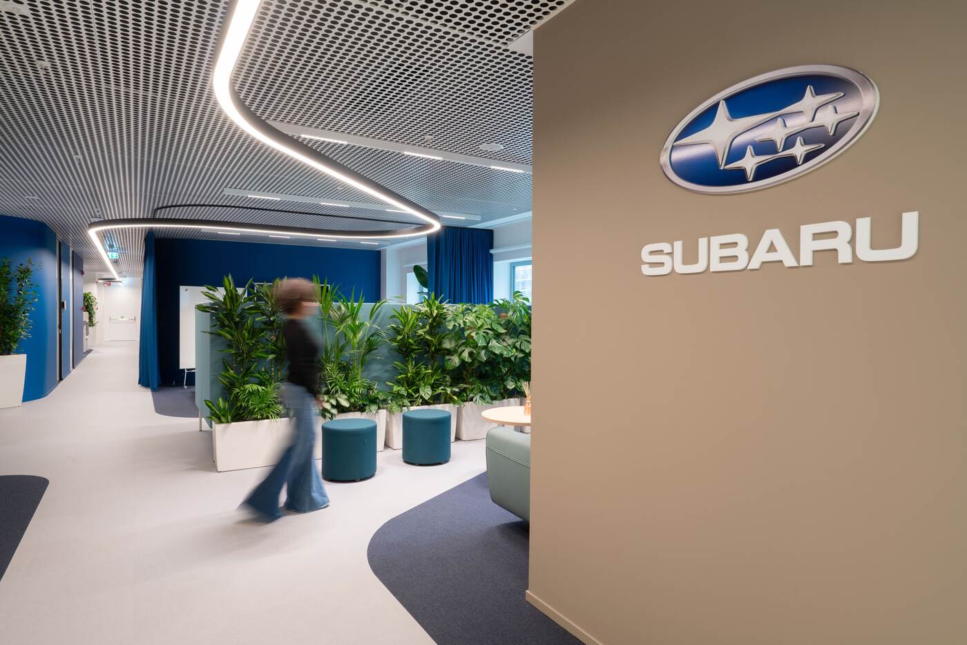 The layout is organised as a journey that guides both staff and visitors through Subaru’s experience, clearly distinguishing public and private areas. A continuous linear light element runs through the space, directing movement, visually connecting the different zones and reinforcing orientation. More than a design detail, it becomes an integral part of the spatial identity, making the environment recognisable and easy to read.